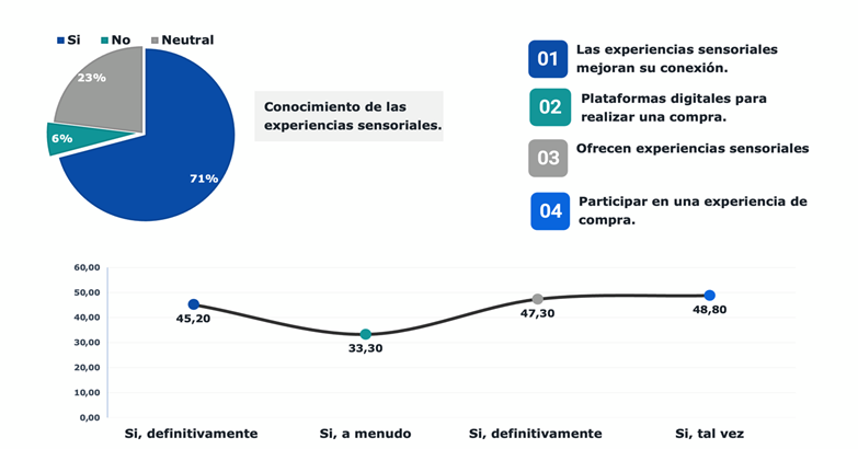 Las experiencias sensoriales son generalmente percibidas como positivas, los resultados muestran una variabilidad significativa en la respuesta emocional de los consumidores. Mientras que una parte significativa de los participantes afirmó que las experiencias sensoriales mejoraron su conexión emocional con las marcas, otra parte se mostró neutral o incluso desconectada de estas estrategias. Este fenómeno puede estar relacionado con las diferencias en las preferencias y percepciones individuales, lo que sugiere que las estrategias de marketing sensorial deben ser altamente personalizadas.