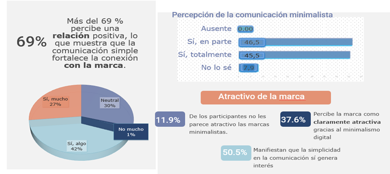 De acuerdo con los datos analizados, la mayoría de los consumidores considera atractivas las marcas que implementan estrategias de minimalismo digital. Doce participantes, equivalentes al 11.9 %, manifestaron poco interés, el 50.5 %, indicaron que sí algo, y el 37.6 %, respondieron sí definitivamente. Como resultado, más del 88 % de los encuestados percibe de manera positiva, mostrando una preferencia clara por marcas que comunican de forma simple, directa y sin saturar al consumidor. Estos hallazgos sugieren que la adopción del minimalismo digital incrementa el atractivo de la marca, fortalece la relación con los consumidores y mejora la percepción de autenticidad y coherencia en la comunicación. Visualización en la figura 1.