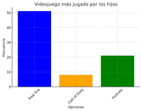 El 63.75% de los niños juega principalmente Free Fire. Este es el videojuego más popular entre los encuestados. El 10% juega principalmente Call of Duty. El 26.25% juega principalmente Fortnite. Este videojuego sigue siendo popular gracias a su estilo de juego dinámico, su componente social y su atractivo visual |