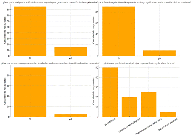 La responsabilidad principal en la regulación de la inteligencia artificial fue uno de los asuntos fundamentales que descubrió la encuesta. La mitad de los encuestados cree que esta tarea le corresponde al gobierno, el 25% a las instituciones internacionales y el 20% a las compañías tecnológicas; solamente un 5% piensa que es responsabilidad de los usuarios. Estos hallazgos evidencian una confianza ciudadana innegable en cuanto a que el Estado y los organismos multilaterales son capaces de salvaguardar la privacidad y la seguridad en el manejo de datos personales.