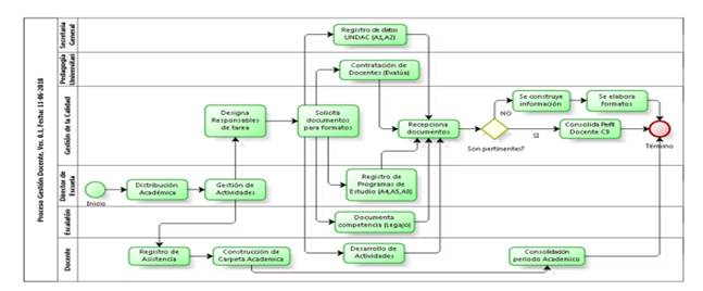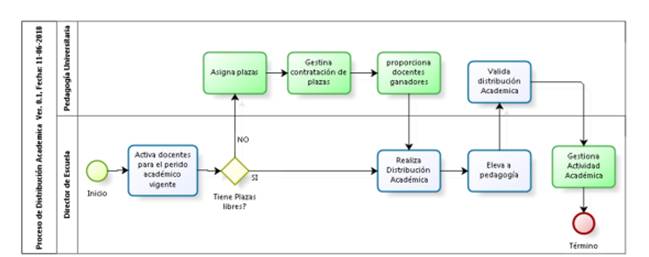 En la figura 1, se indica el proceso de distribución académica, el cual inicia cuando el Director de Escuela elabora la distribución académica validando a los docentes activos en el periodo académico actual, en el caso que necesite plazas docentes solicitara la asignación correspondiente a Pedagogía universitaria, quien proporciona los docentes, una vez elaborado la distribución de plazas solicita la aprobación y validación de Pedagogía con lo que se da inicio a las actividades académicas.