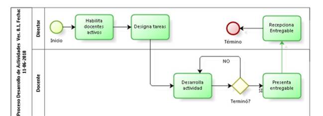 En la figura 2, se evidencia el desarrollo de actividades, el cual inicia cuando el Director designa actividades a los docentes hábiles, el docente desarrolla la actividad encomendada y cuando termina presenta los entregables, el Director recepciona y valida la actividad.