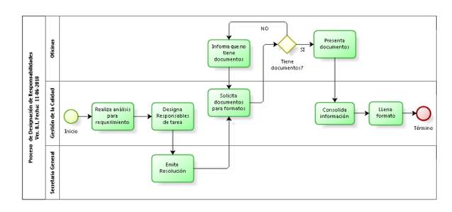 En la figura 3, se evidencia la designación de responsabilidades, el cual inicia cuando Gestión de Calidad realiza un análisis de requerimiento, designa responsables de tarea, secretaria general emite resolución de designación, Gestión de Calidad solicita los documentos para el llenado de formatos, las oficinas remiten la documentación y en caso de no contar con ello realiza el informe correspondiente, para luego la oficina de gestión de la calidad realice el consolidado.