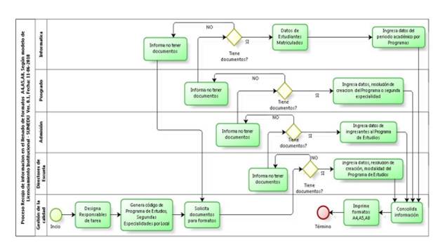 En la figura 5, se encuentra el registro de programas de estudio A4, A5, A8, Inicia cuando Gestión de la Calidad genera los códigos de los programas de estudio, especialidades por local, solicita documentos a Dirección de Escuela, Admisión, Posgrado e informática referente a programas de estudio, alumnos y en el caso que estas oficinas no tengan la documentación pertinente realizan un informe, con esta información Gestión de Calidad realiza la consolidación e imprime los formatos A4, A5, A8.