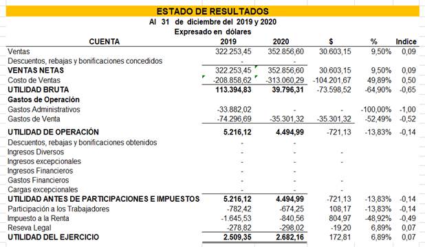 El análisis de los estados financieros realizado en la Federación de Pequeños Exportadores Agropecuarios Orgánicos APEOSAE de la Provincia de Zamora Chinchipe, presenta como dato relevante, que las ventas no sufrieron alteraciones durante el primer año de pandemia, esto se debe a que la demanda de productos agropecuarios se mantuvo constante en el mercado internacional. Sin embargo, se debe precisar que la Federación de Pequeños exportadores si atravesó dificultades con los medios de transporte, debido a las medidas establecidas por los gobiernos para controlar la crisis sanitaria.